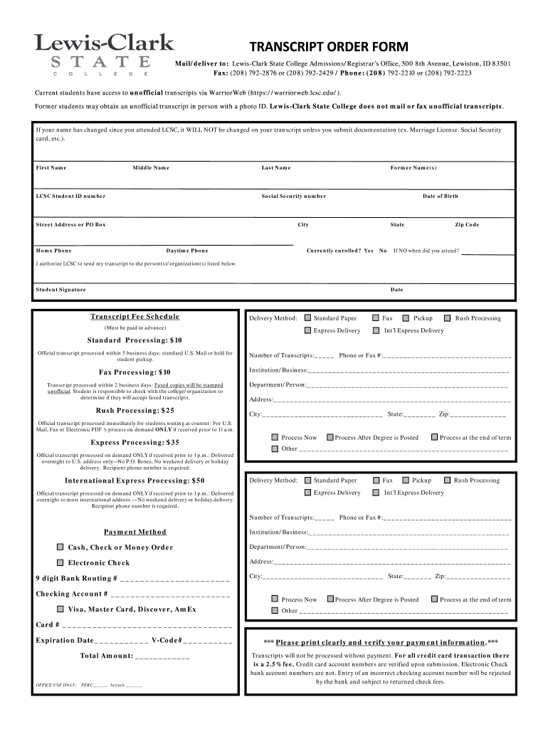 The Transcript Order Form is a document used by students of Lewis-Clark State College to request official or unofficial transcripts for educational purposes.