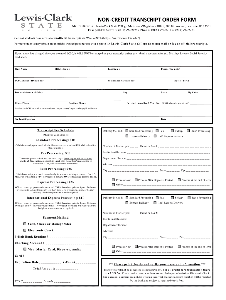 NON?CREDIT TRANSCRIPT ORDER FORM Mail/deliver to: Lewis-Clark State College Admissions/Registrar s Office, 500 8th Avenue, Lewiston, ID 83501 Fax: (208) 792-2876 or (208) 792-2429 / Phone: (208) 792-2210