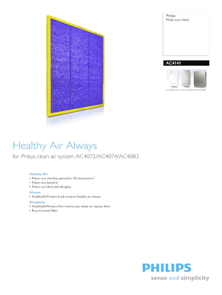 Philips Multicar filter AC4141 Healthy Air Always for Philips clean air system AC4072/AC4074/AC4083 Healthy Air Filters out ultrafine particles 20 nanometers* Filters out bacteria Filters out dust