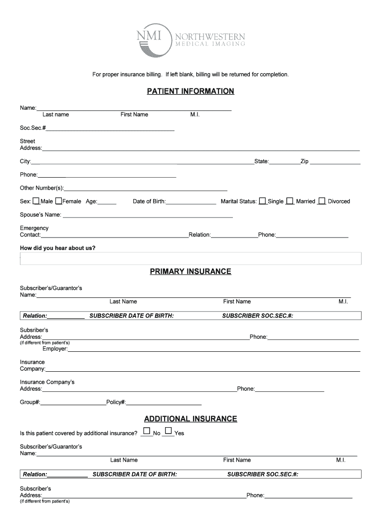 For proper insurance billing. If left blank, billing will be returned for completion. PATIENT INFORMATION Name: Last name First Name M.I. Soc.Sec.# Street Address: City: State: Zip: Phone: Other Number(s):
