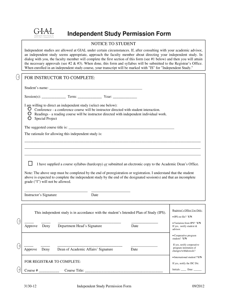 Independent Study Permission Form NOTICE TO STUDENT Independent studies are allowed at GOAL under certain circumstances. If, after consulting with your academic advisor, an independent study seems