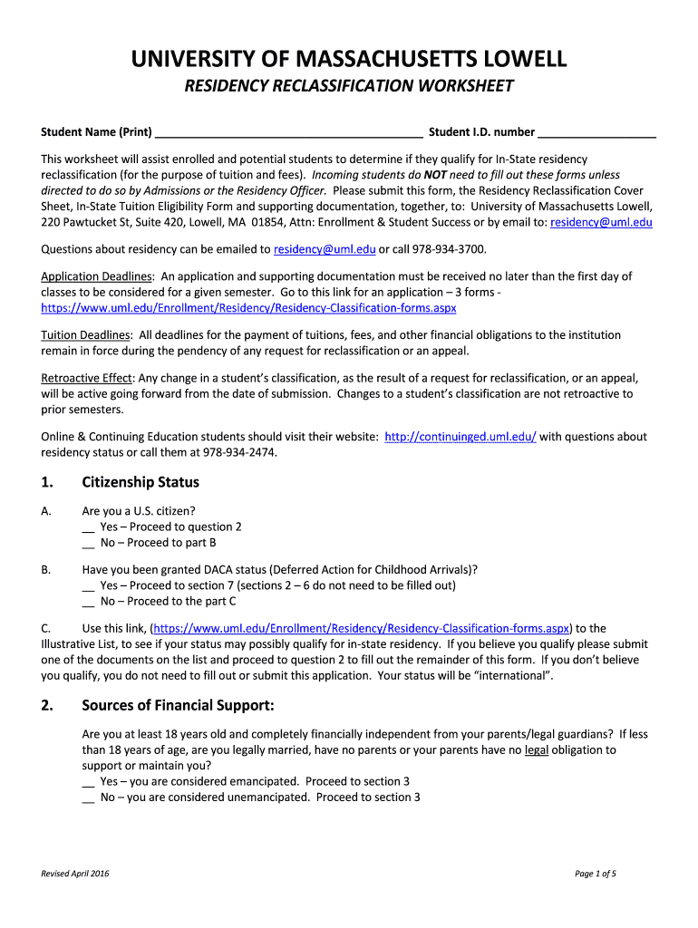 UNIVERSITY OF MASSACHUSETTS LOWELL RESIDENCY RECLASSIFICATION WORKSHEET Student Name (Print) Student I.D. number This worksheet will assist enrolled and potential students to determine if they qualify