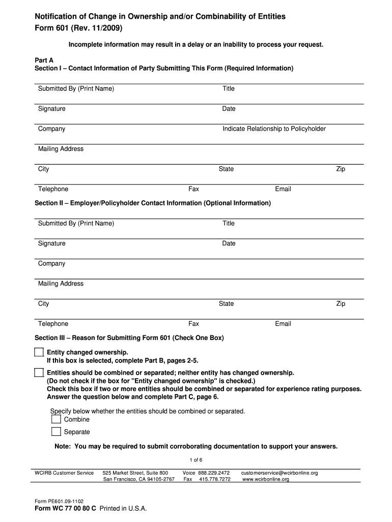 Notification of Change in Ownership and/or Combinability of Entities Form 601 (Rev. 11/2009) Incomplete information may result in a delay or an inability to process your request. Part A Section I