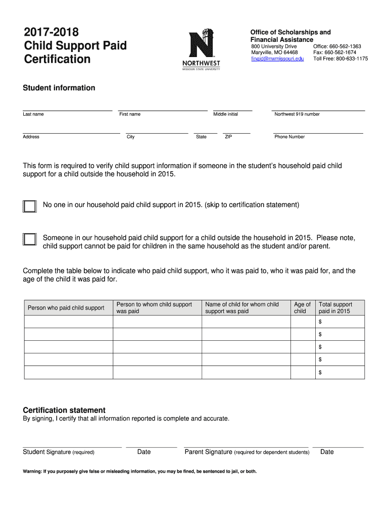 20172018 Child Support Paid Certification Office of Scholarships and Financial Assistance 800 University Drive Maryville, MO 64468 fin aid Missouri.edu Office: 6605621363 Fax: 6605621674 Toll Free: