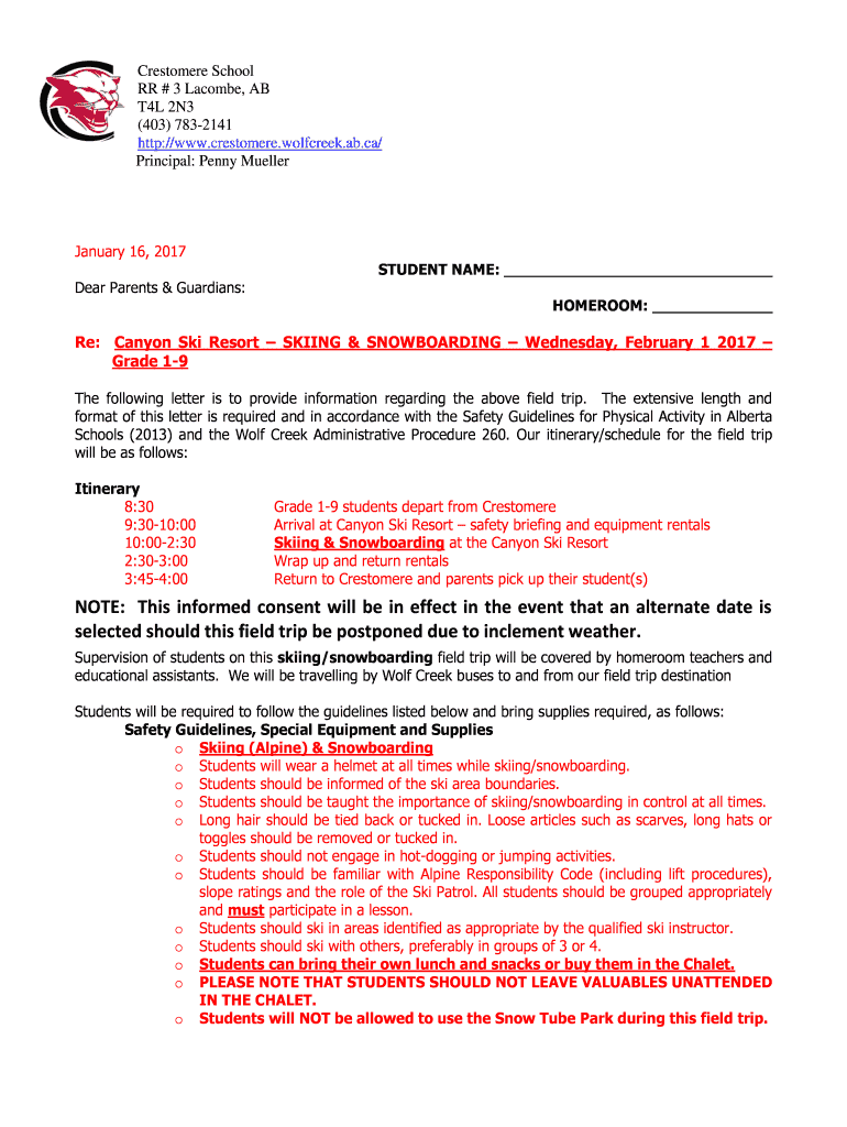 Customer School RR # 3 Wycombe, AB T4L 2N3 (403) 7832141 http://www.crestomere.wolfcreek.ab.ca/ Principal: Penny Mueller January 16, 2017, Dear Parents & Guardians: STUDENT NAME: HOMEROOM: Re: Canyon