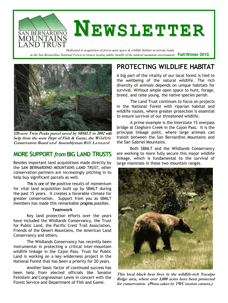 NEWSLETTER Dedicated to acquisition of forest open space & wildlife habitat on private lands in the San Bernardino National Forest to ensure lasting public benefit of the natural mountain environment.