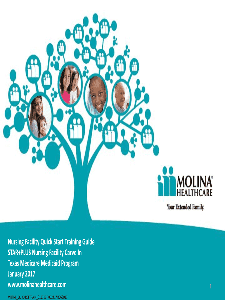 Nursing Facility Quick Start Training Guide STAR+PLUS Nursing Facility Carve In Texas Medicare Medicaid Program January 2017 www.molinahealthcare.com MH TNF QUICKREFTRAIN 011717 R052417 R0630171Headline