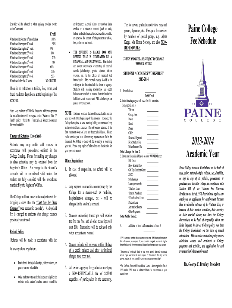 The Paine College Student Accounts Worksheet is a document designed to assist students in calculating their financial obligations for college. This college tuition fee worksheet serves as a practical tool that includes comprehensive details about tuition, fees, room and board costs, and available financial aid. By utilizing this form, students can gain a clear understanding of their financial responsibilities.
