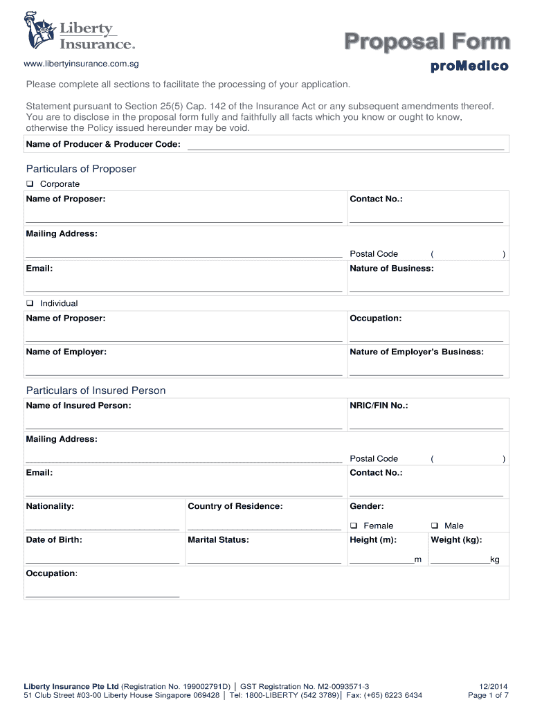 WWW.libertyinsurance.com.SG Please complete all sections to facilitate the processing of your application. Statement pursuant to Section 25(5) Cap. 142 of the Insurance Act or any subsequent amendments