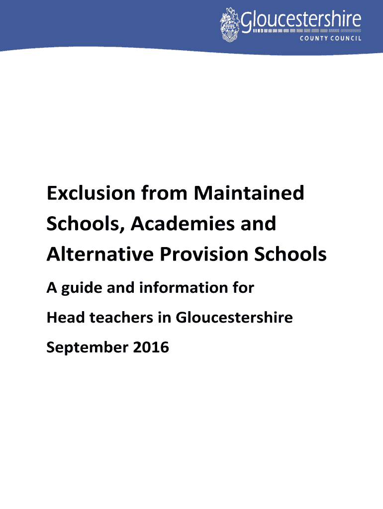 Exclusion from Maintained Schools, Academies and Alternative Provision Schools A guide and information for Head teachers in Gloucestershire September 2016 Contents Introduction Advice for schools