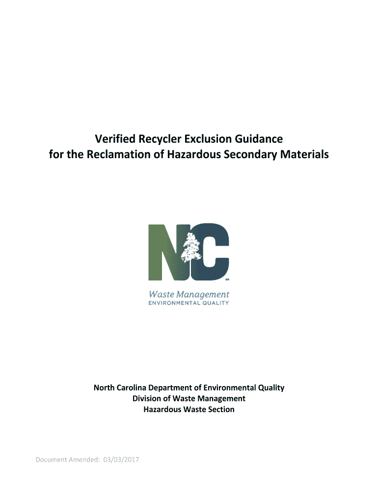 Verified Recycler Exclusion Guidance for the Reclamation of Hazardous Secondary Materials North Carolina Department of Environmental Quality Division of Waste Management Hazardous Waste Section Document