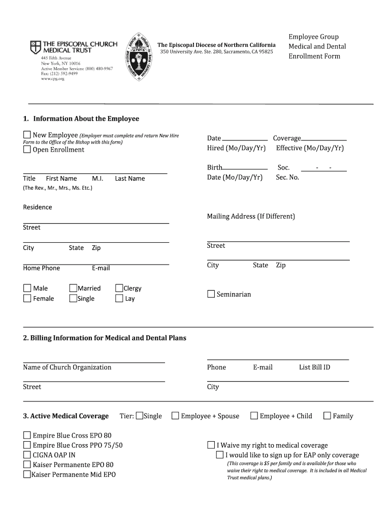 Employee Group Medical and Dental Enrollment Form The Episcopal Diocese of Northern California 350 University Ave. Ste. 280, Sacramento, CA 95825 1. Information About the Employee New Employee (Employer