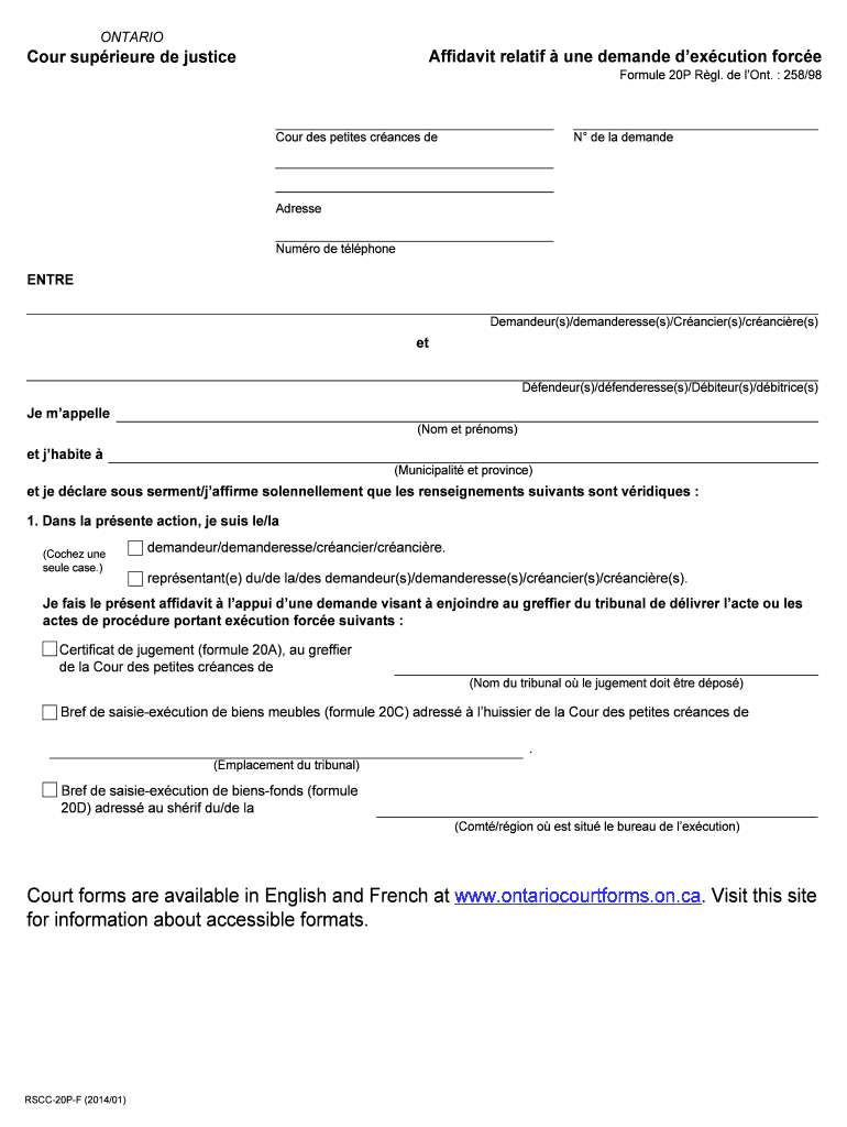 ONTARIO Affidavit related one demand execution force Four supreme DE justice Formula 20P RTL. DE long. 258/98 Four DES petites chances de N de la demand Address Humor DE phone ENTIRE Demander(s)/demanders(s)/Chancier(s)/Francine(s)