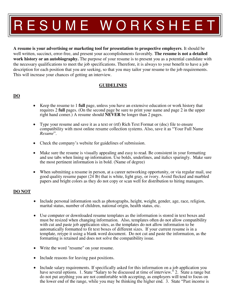 RESUME WORKSHEET A resume is your advertising or marketing tool for presentation to prospective employers. It should be well written, succinct, error-free, and present your accomplishments favorably.