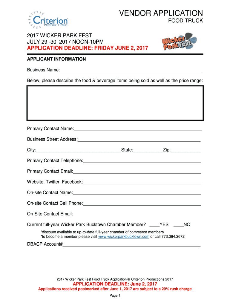 VENDOR APPLICATION FOOD TRUCK 2017 WICKER PARK FEST JULY 29 30, 2017 NOON10PM APPLICATION DEADLINE: FRIDAY, JUNE 2, 2017, APPLICANT INFORMATION Business Name: Below, please describe the food & beverage