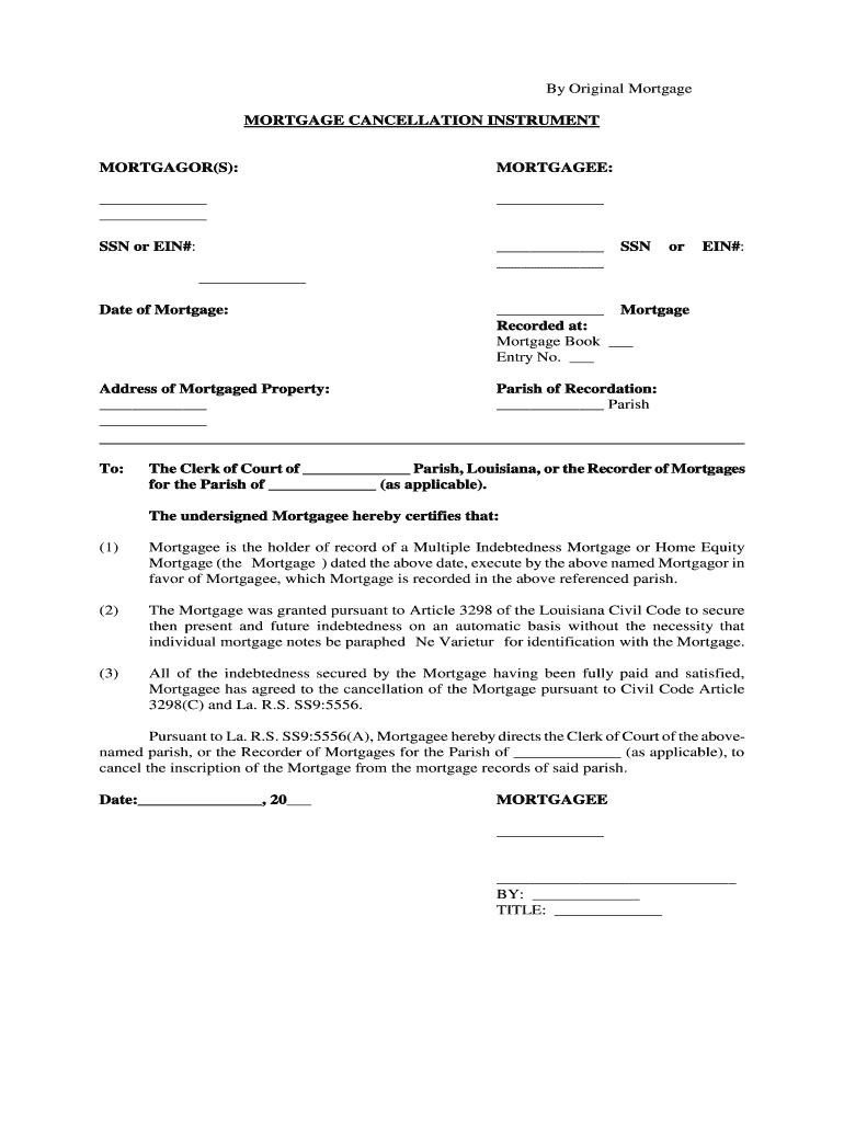 By Original Mortgage CANCELLATION INSTRUMENT MORTGAGOR(S): MORTGAGEE: SSN or EIN#: SSN or EIN#: Date of Mortgage: Mortgage Recorded at: Mortgage Book Entry No. Address of Mortgaged Property: Parish