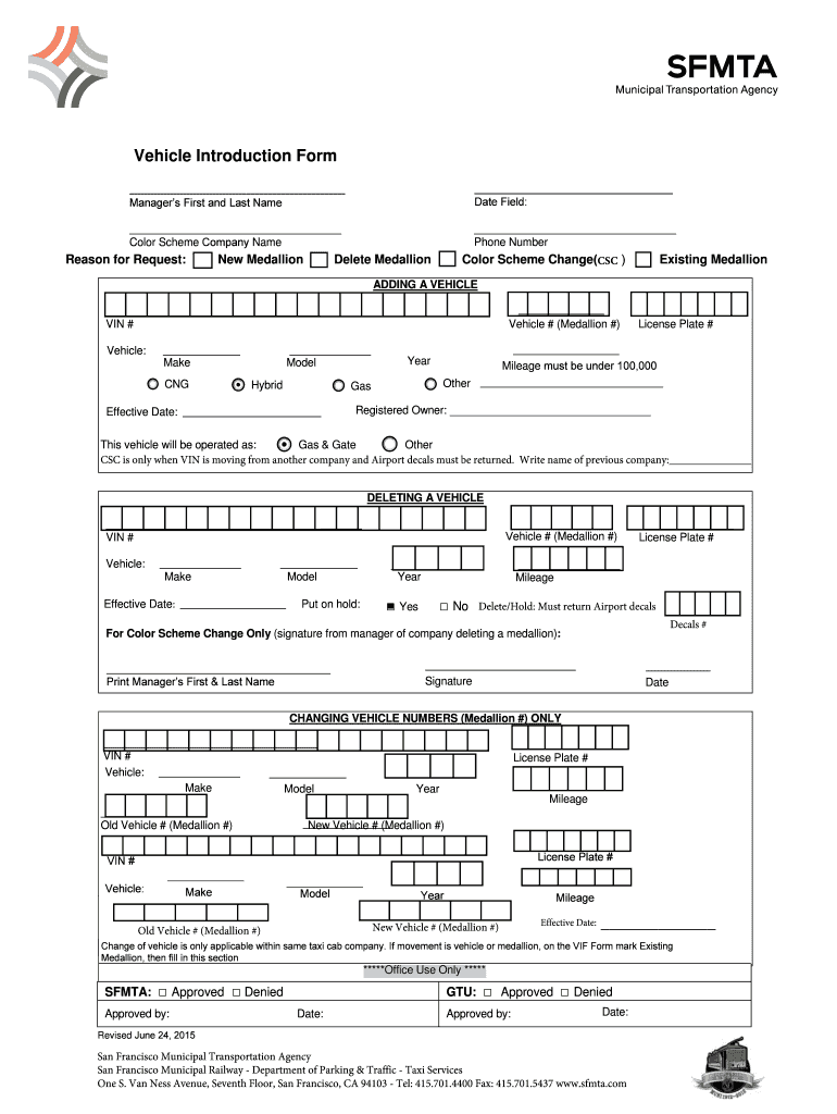 Vehicle Introduction Form Managers First and Last Name Date Field: Color Scheme Company Name Phone Number Reason for Request: New Medallion Color Scheme Change(CSC) Delete Medallion Existing Medallion
