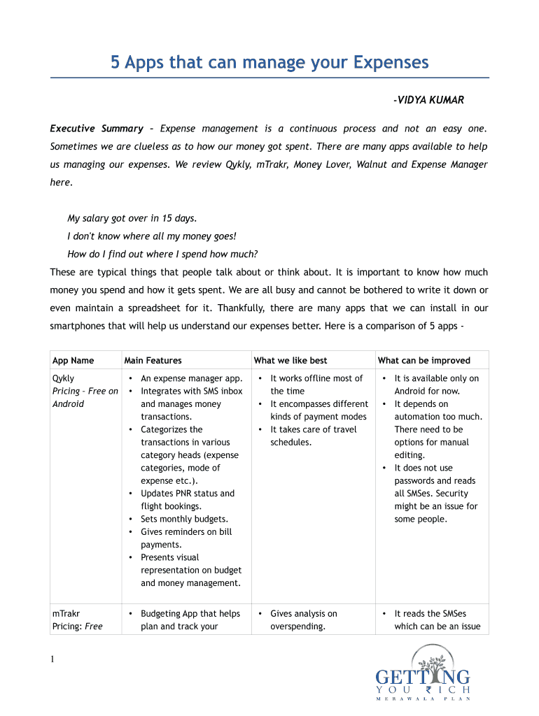 5 Apps that can manage your Expenses VIDA KUMAR Executive Summary Expense management is a continuous process and not an easy one. Sometimes we are clueless as to how our money got spent. There are