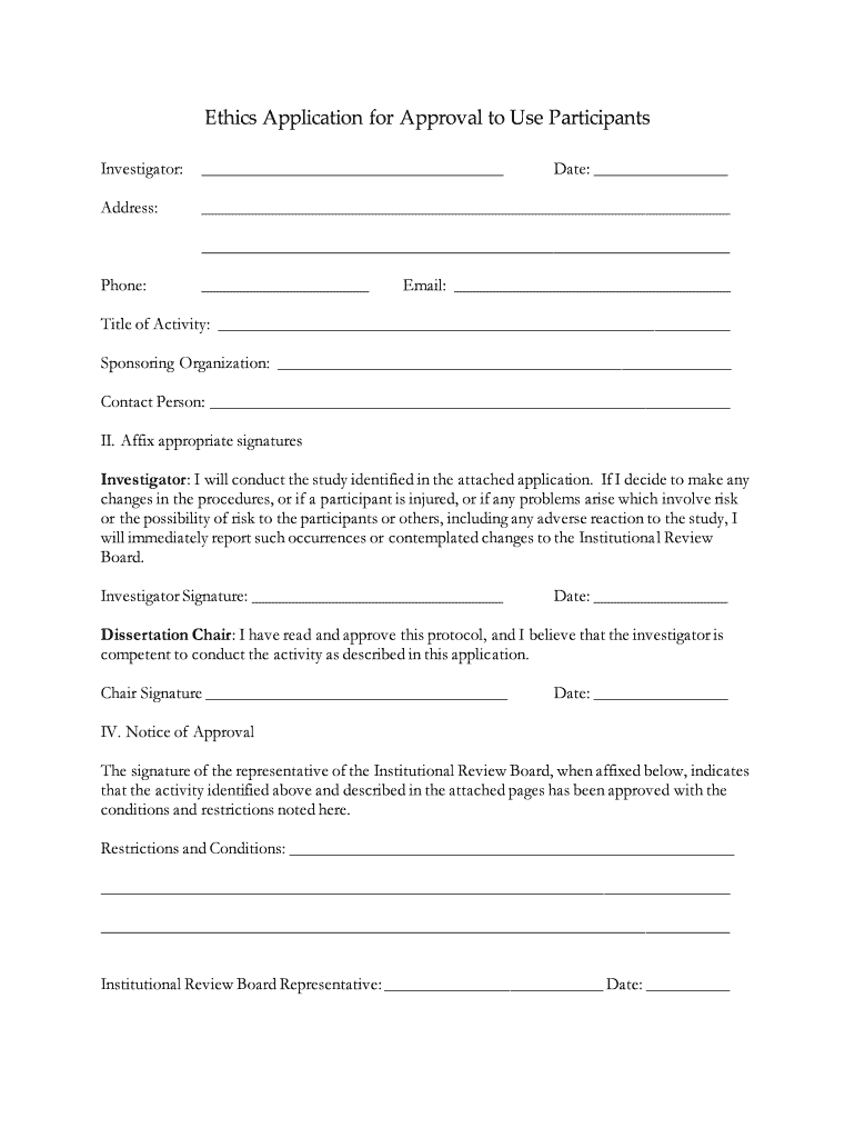 Ethics Application for Approval to Use Participants Investigator: Date: Address: Phone: Email: Title of Activity: Sponsoring Organization: Contact Person: II. Affix appropriate signatures Investigator: