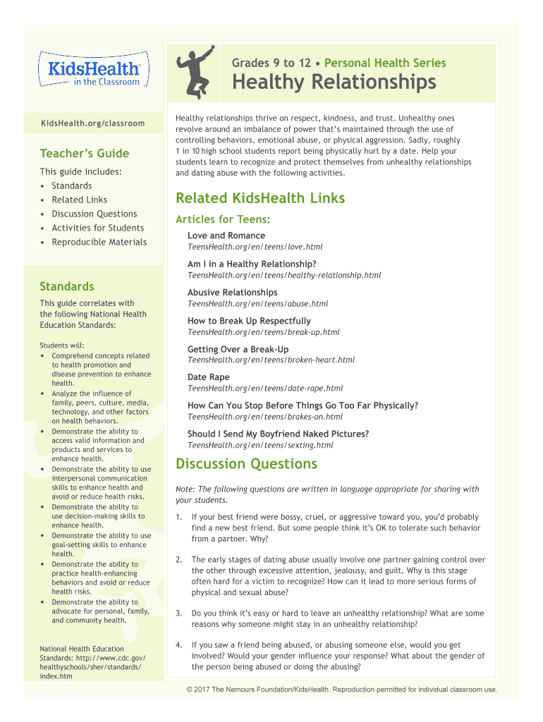 Grades 9 to 12 Personal Health SeriesHealthy Relationships KidsHealth.org/classroomTeachers Guide This guide includes: Standards Related Links Discussion Questions Activities for StudentsHealthy relationships