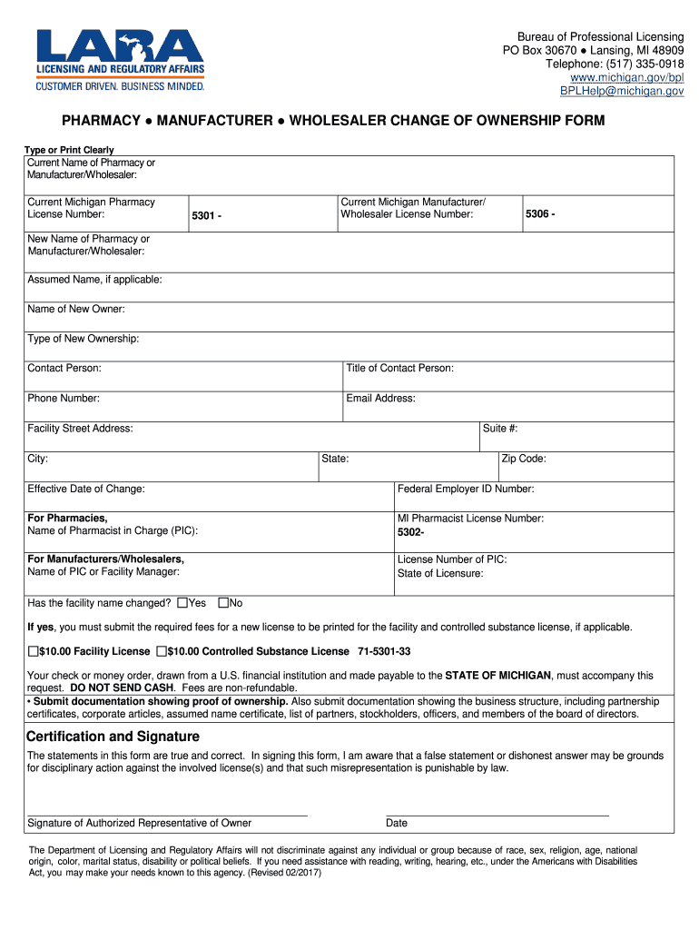 Bureau of Professional Licensing PO Box 30670 Lansing, MI 48909 Telephone: (517) 3350918 www.michigan.gov/bpl Help Michigan.gov PHARMACY MANUFACTURER WHOLESALER CHANGE OF OWNERSHIP FORM Type or Print