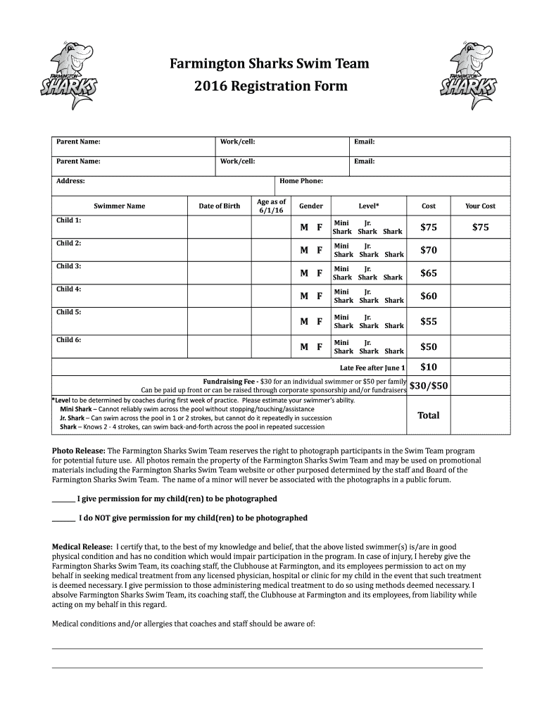 Farmington Sharks Swim Team 2016 Registration Form Parent Name: Work/cell: Email: Parent Name: Work/cell: Email: Address: Home Phone: Swimmer Name Date of Birth Age as of 6/1/16 Child 2: Child 3: