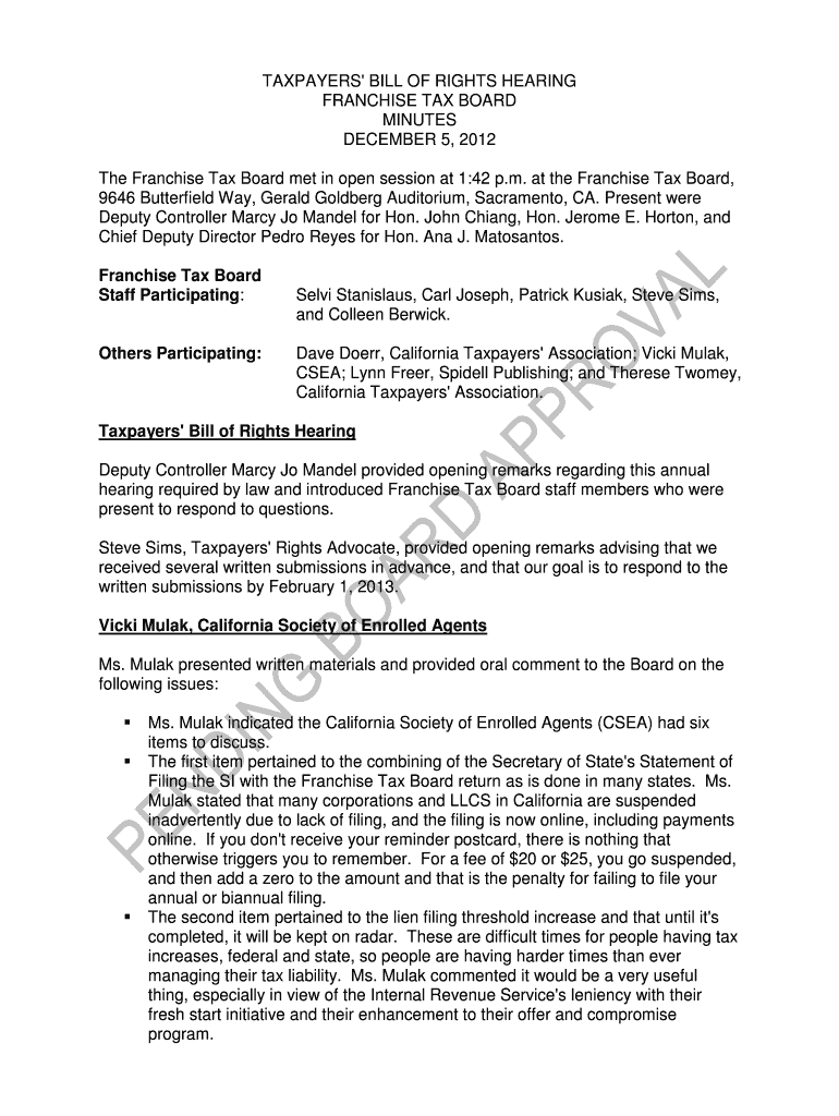 Get the free TAXPAYERS' BILL OF RIGHTS HEARING - ftb ca