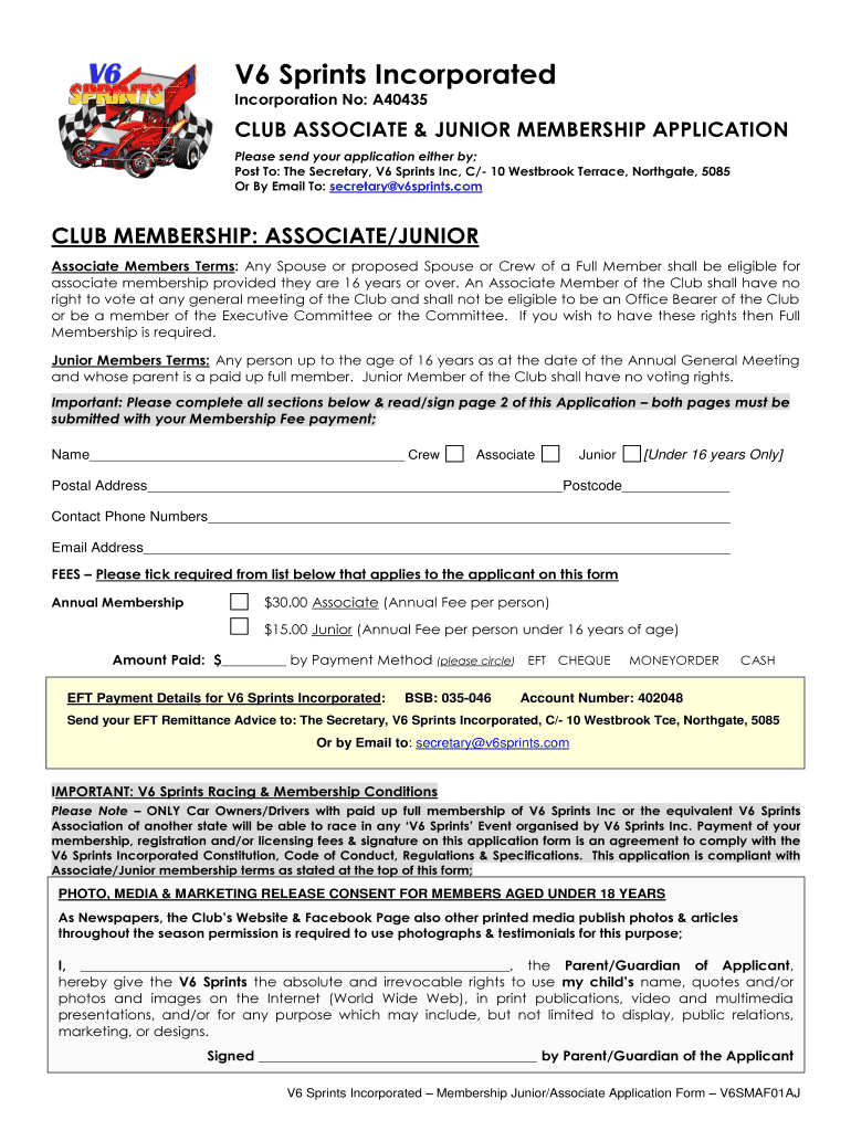 V6 Sprints Incorporated Incorporation No: A40435 CLUB ASSOCIATE & JUNIOR MEMBERSHIP APPLICATION Please send your application either by; Post To: The Secretary, V6 Sprints Inc, C/ 10 Westbrook Terrace,