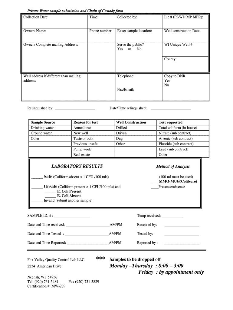 Private Water sample submission and Chain of Custody form Collection Date: Time: Collected by: LIC # (PIED MP MPR): Owners Name: Phone number Exact sample location: Well construction Date Serve the