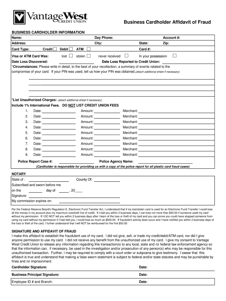 Business Cardholder Affidavit of Fraud BUSINESS CARDHOLDER INFORMATION Name: Day Phone: Address: City: Card Type: Credit Debit stolen State: ATM lost Account #: Visa or ATM Card Was: Zip: Card #:
