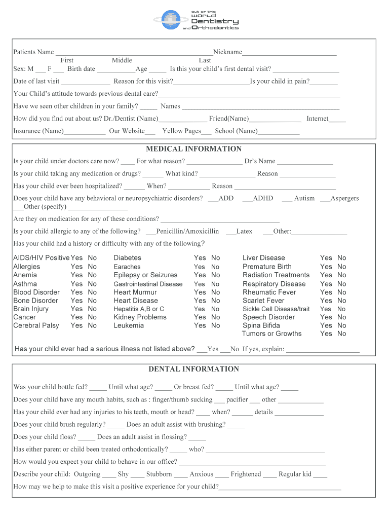 Out of this World OUT OF THIS WORLD DENTISTRY and Orthodontics Patients Name Nickname First Middle Last Sex: M F Birth date Age Is this your children first dental visit? Date of last visit Reason