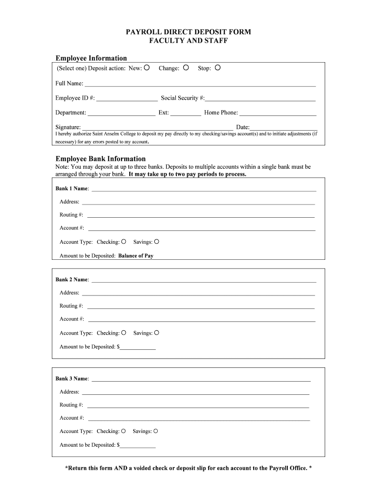 The Payroll Direct Deposit Form is essential for faculty and staff at Saint Anselm College, facilitating the seamless process of payroll management. This form serves to authorize direct deposits, ensuring that employee pay is transferred securely into specified bank accounts. By using this form, employees can streamline their payment process, reducing delays and enhancing convenience.