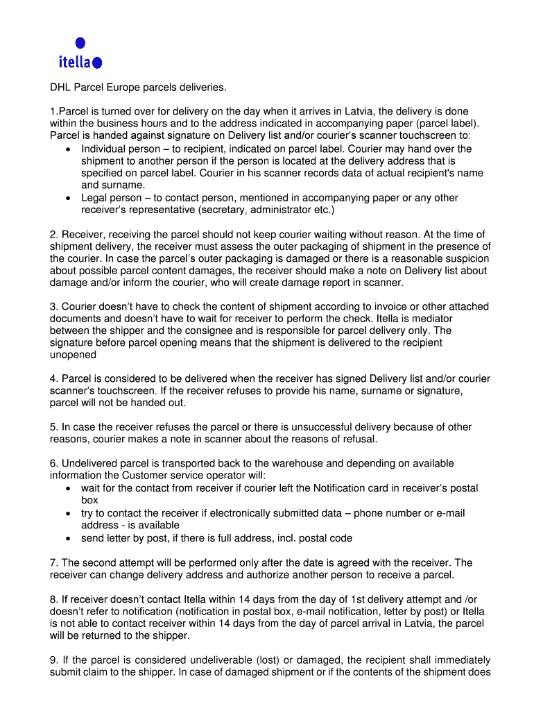 DHL Parcel Europe parcels deliveries. 1. Parcel is turned over for delivery on the day when it arrives in Latvia, the delivery is done within the business hours and to the address indicated in accompanying