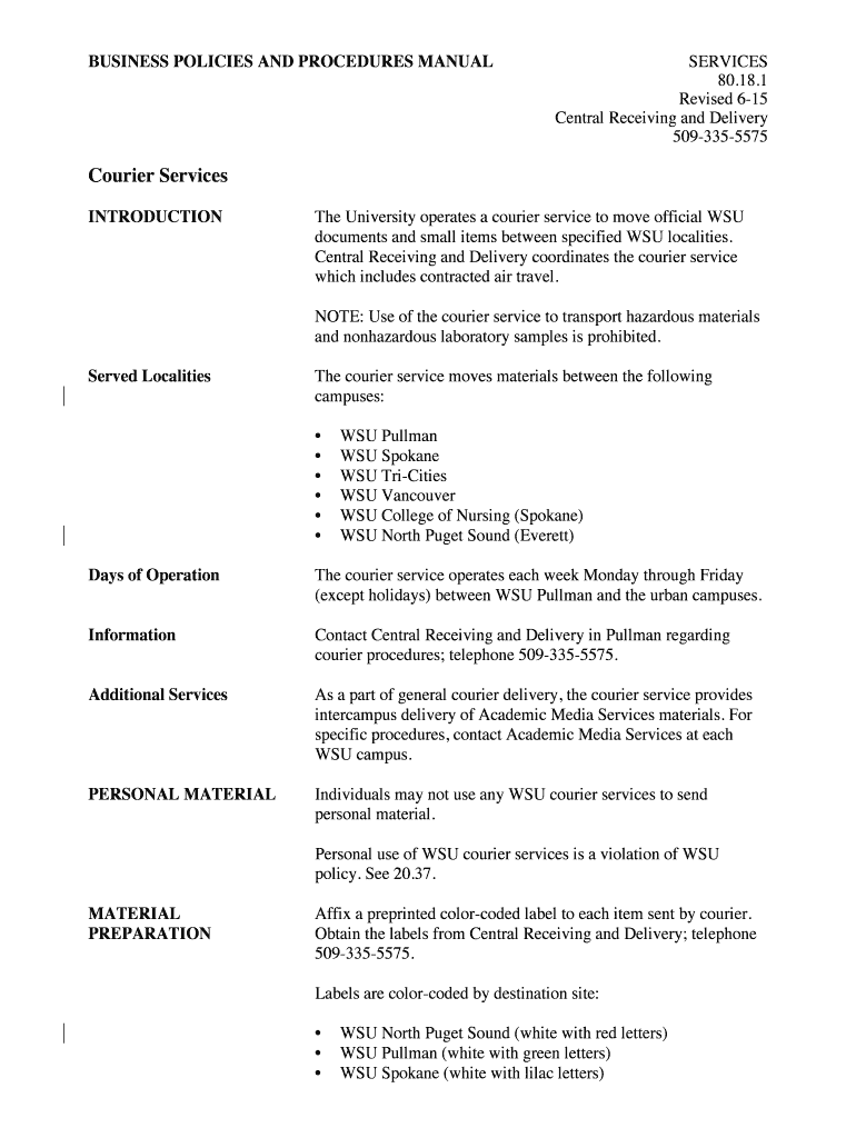 BUSINESS POLICIES AND PROCEDURES MANUAL SERVICES 80.18.1 Revised 615 Central Receiving and Delivery 5093355575 Courier Services INTRODUCTION The University operates a courier service to move official