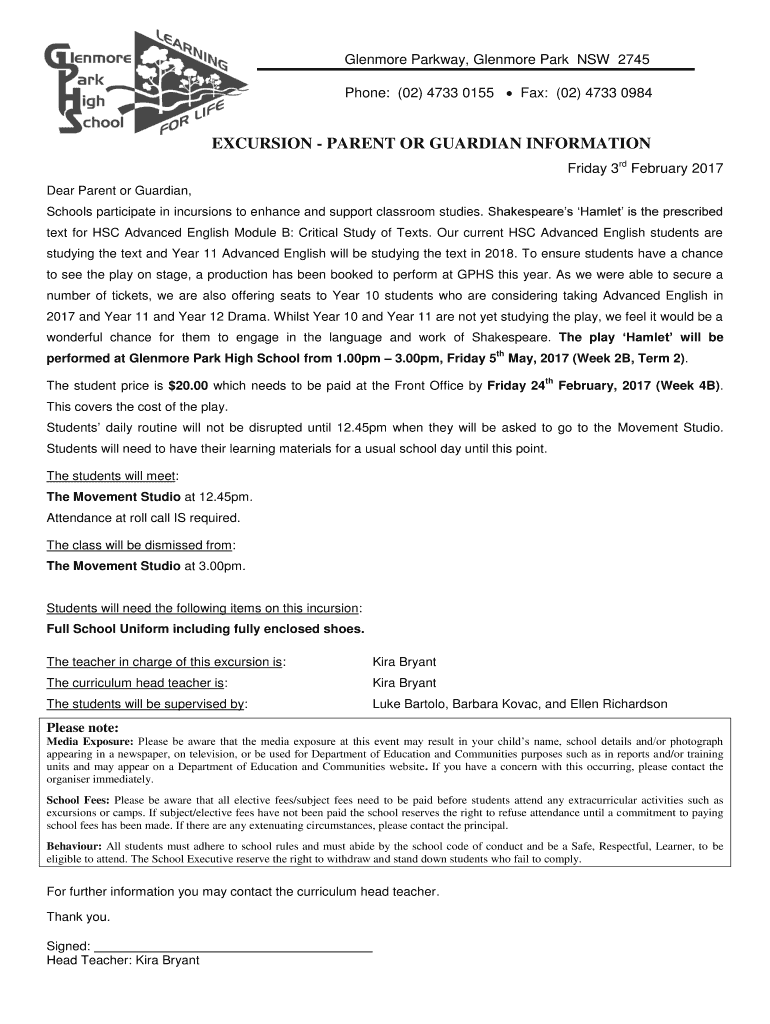 Glen more Parkway, Glen more Park NSW 2745 Phone: (02) 4733 0155 Fax: (02) 4733 0984 EXCURSION PARENT OR GUARDIAN INFORMATION Friday 3rd February 2017 Dear Parent or Guardian, Schools participate