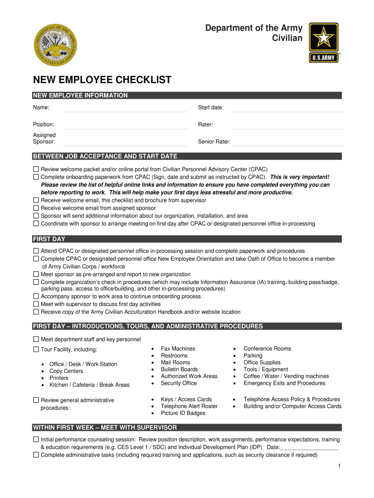 Department of the Army Civilian NEW EMPLOYEE CHECKLIST NEW EMPLOYEE INFORMATION Name: Start date: Position: Rater: Assigned Sponsor: Senior Rater: BETWEEN JOB ACCEPTANCE AND START DATE Review welcome