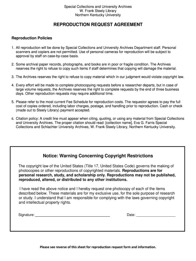Special Collections and University Archives W. Frank Steely Library Northern Kentucky University REPRODUCTION REQUEST AGREEMENT Reproduction Policies 1. All reproduction will be done by Special Collections