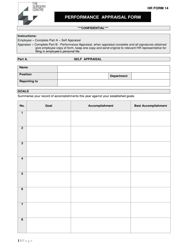 HR FORM 14 PERFORMANCE APPRAISAL FORM ***CONFIDENTIAL*** Instructions: Employee Complete Part A Self Appraisal Appraiser Complete Part B Performance Appraisal, when appraisal complete and all signatures