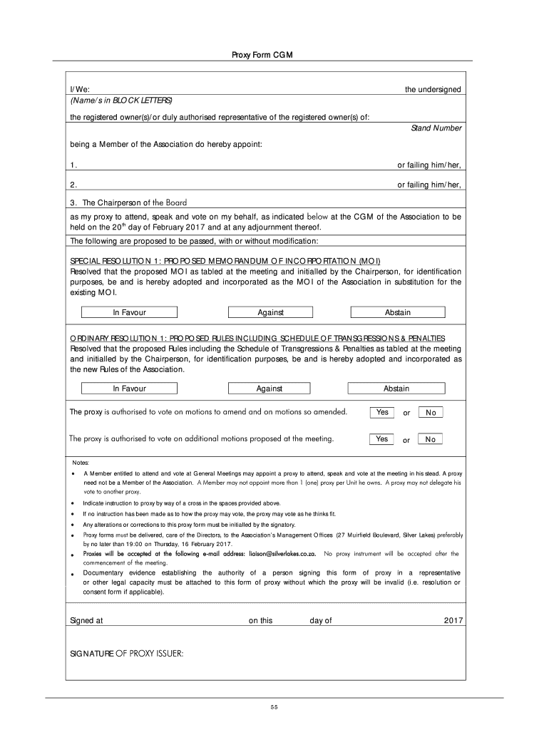 Proxy Form CGM I/We: (Name/s in BLOCK LETTERS) the undersigned the registered owner(s)/or duly authorized representative of the registered owner(s) of: Stand Number being a Member of the Association