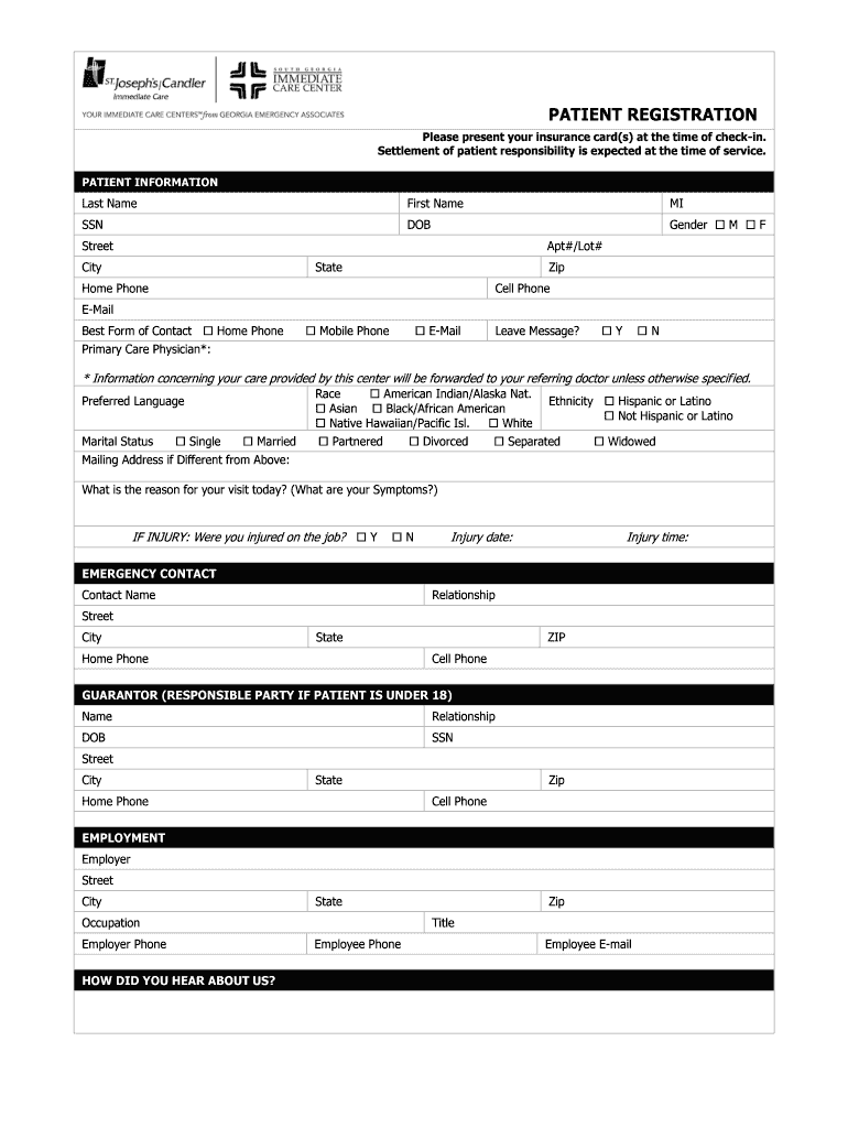 PATIENT REGISTRATION Please present your insurance card(s) at the time of checking. Settlement of patient responsibility is expected at the time of service. PATIENT INFORMATION Last Name First Name