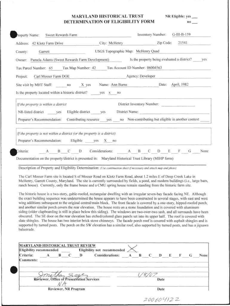MARYLAND HISTORICAL TRUST DETERMINATION OF ELIGIBILITY FORM Property Name: Sweet Rewards Farm Inventory Number: Address: 42 Klutz Farm Drive County: Owner: City: McHenry Garrett Zip Code: Pamela Adams