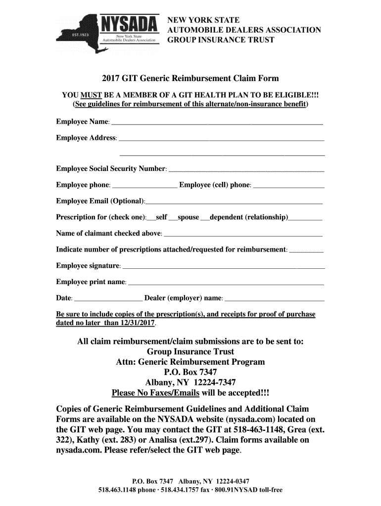 2017 GIT Generic Reimbursement Claim Form YOU MUST BE A MEMBER OF A GIT HEALTH PLAN TO BE ELIGIBLE!!! (See guidelines for reimbursement of this alternate/noninsurance benefit) Employee Name: Employee