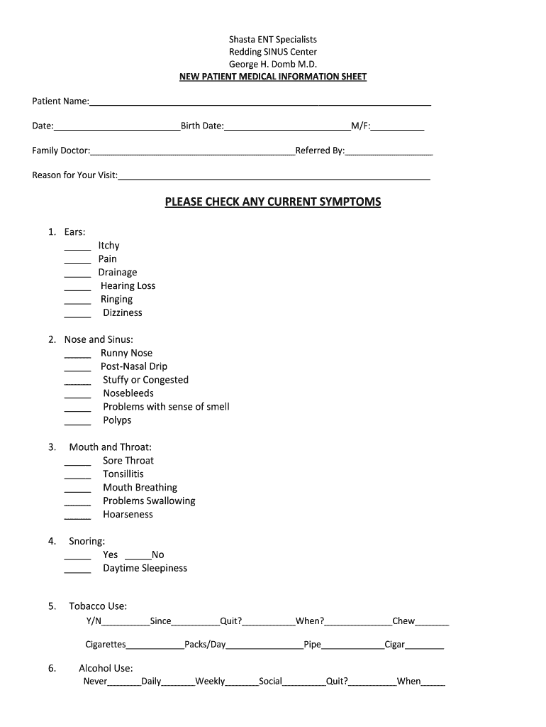 Shasta ENT Specialists Redding SINUS Center George H. Bomb M.D. NEW PATIENT MEDICAL INFORMATION SHEET Patient Name: Date: Birth Date: M/F: Family Doctor: Referred By: Reason for Your Visit: PLEASE