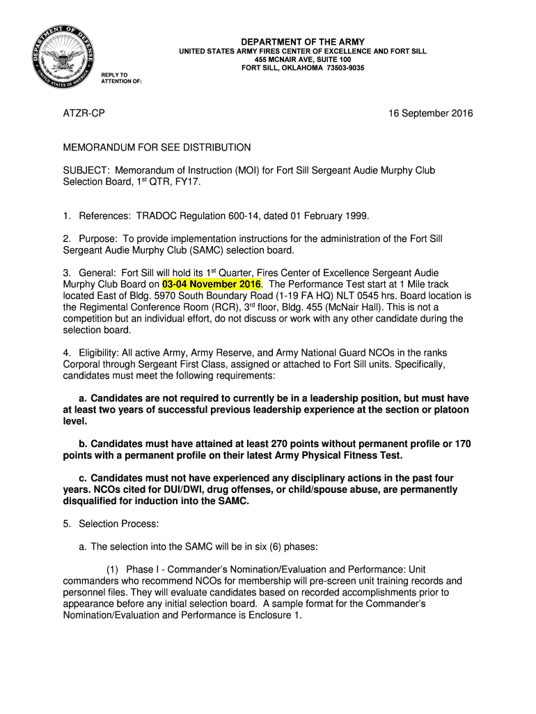 DEPARTMENT OF THE ARMY UNITED STATES ARMY FIRES CENTER OF EXCELLENCE AND FORT SILL 455 McNair AVE, SUITE 100 FORT SILL, OKLAHOMA 735039035 REPLY TO ATTENTION OF: ATZ RCP 16 September 2016 MEMORANDUM