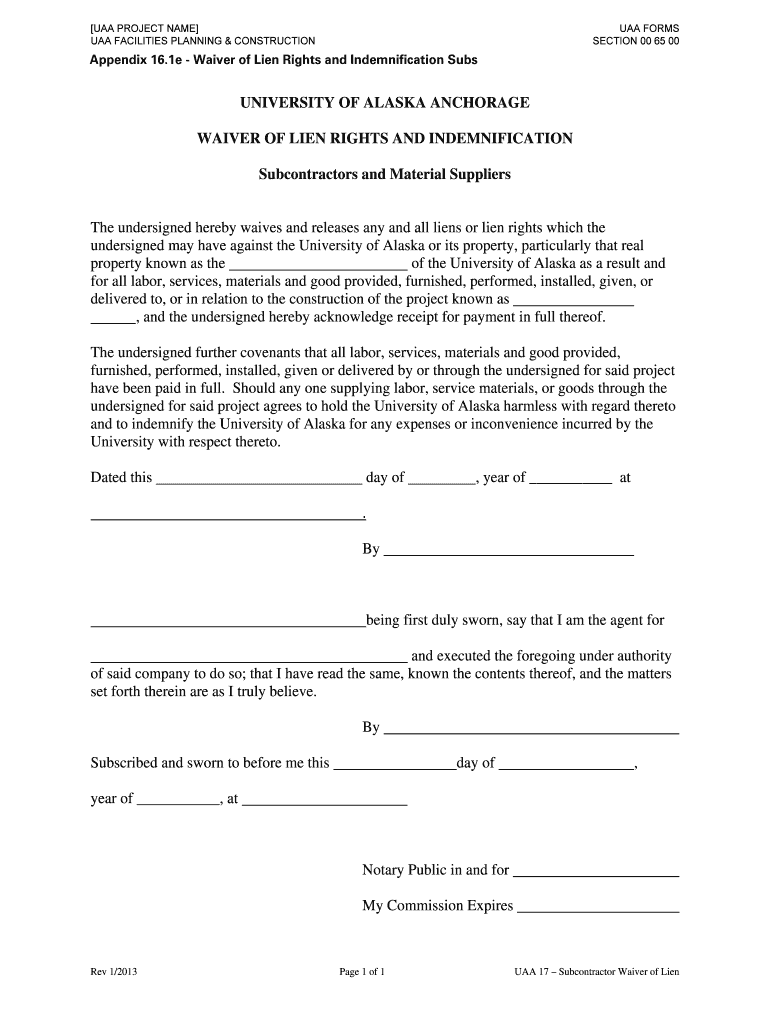UAA PROJECT NAME UAA FACILITIES PLANNING & CONSTRUCTION UAA FORMS SECTION 00 65 00 Appendix 16.1e Waiver of Lien Rights and Indemnification Subs UNIVERSITY OF ALASKA ANCHORAGE WAIVER OF LIEN RIGHTS