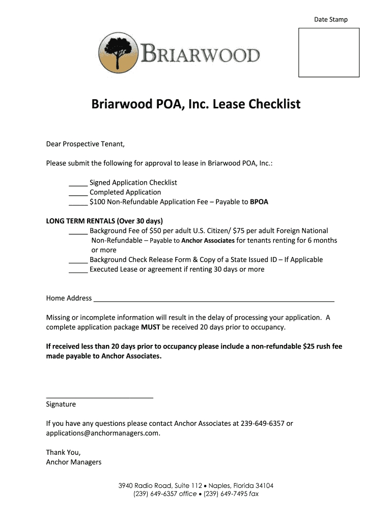 Date Stamp Braidwood POA, Inc. Lease Checklist Dear Prospective Tenant, Please submit the following for approval to lease in Braidwood POA, Inc.: Signed Application Checklist Completed Application
