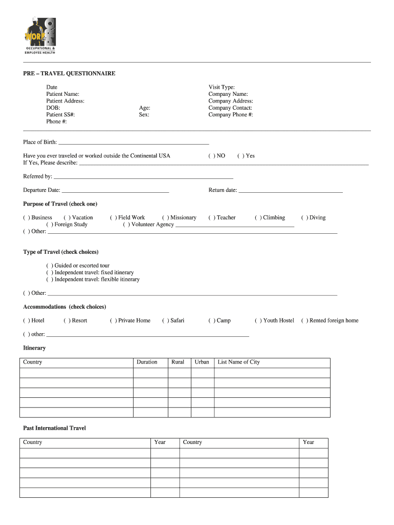 PRE TRAVEL QUESTIONNAIRE Date Visit Type: Patient Name: Company Name: Patient Address: Company Address: DOB: Age: Company Contact: Patient SS#: Sex: Company Phone #: Phone #: Place of Birth: Have