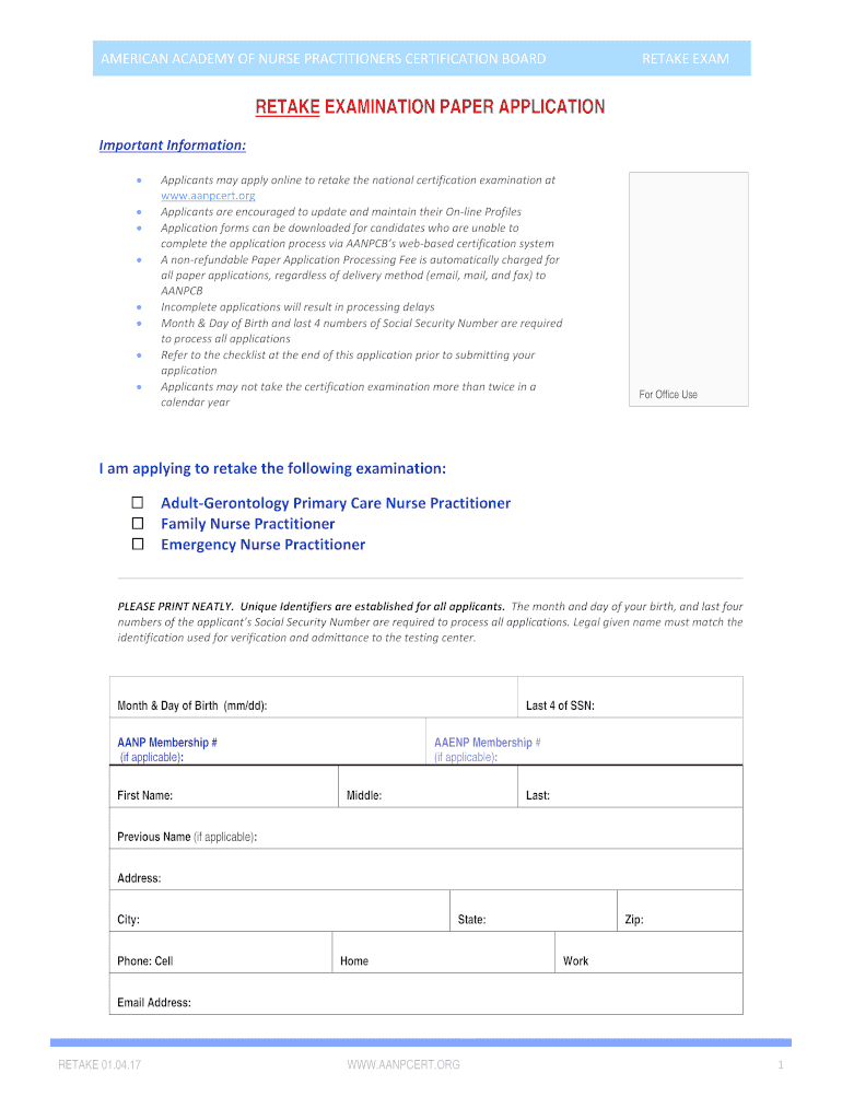 AMERICAN ACADEMY OF NURSE PRACTITIONERS CERTIFICATION BOARD RETAKE EXAM RETAKE EXAMINATION PAPER APPLICATION Important Information: Applicants may apply online to retake the national certification
