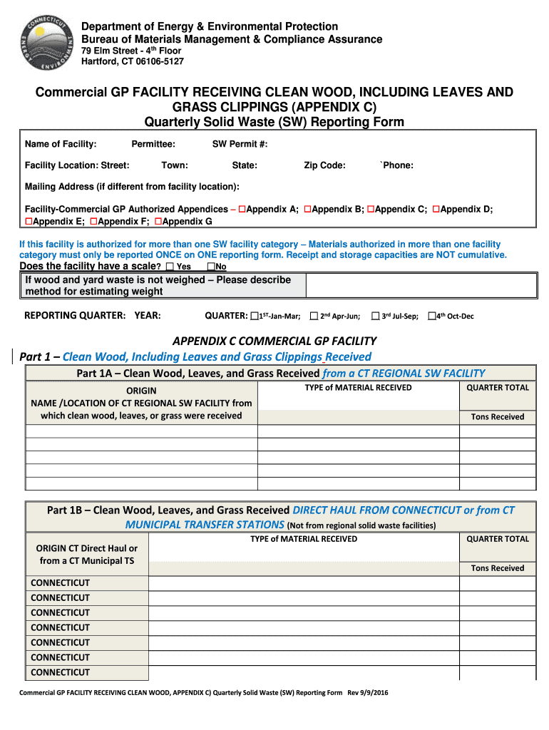 Department of Energy & Environmental Protection Bureau of Materials Management & Compliance Assurance 79 Elm Street 4th Floor Hartford, CT 061065127 Commercial GP FACILITY RECEIVING CLEAN WOOD, INCLUDING