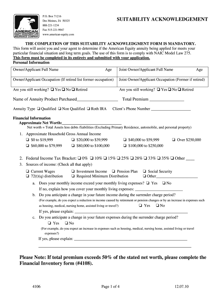 The Suitability Acknowledgement Form is an essential component of annuity applications, designed to ensure that the selected annuity product aligns with the financial situation and long-term goals of the applicant. This form plays a critical role in determining financial suitability for annuity products, facilitating a thorough assessment based on the applicant's personal financial landscape. Furthermore, it adheres to the NAIC Model Law 275, which emphasizes regulatory compliance and promotes responsible financial practices.
